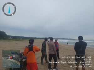 Koramil 0315/Bayah, kecamatan Bayah, Pemdes Sawarna, BPBD kecamatan Bayah, Basarnas, Balawista dan Nelayan setempat bersama relawan instansi lainnya. Minggu (18/01/2026).