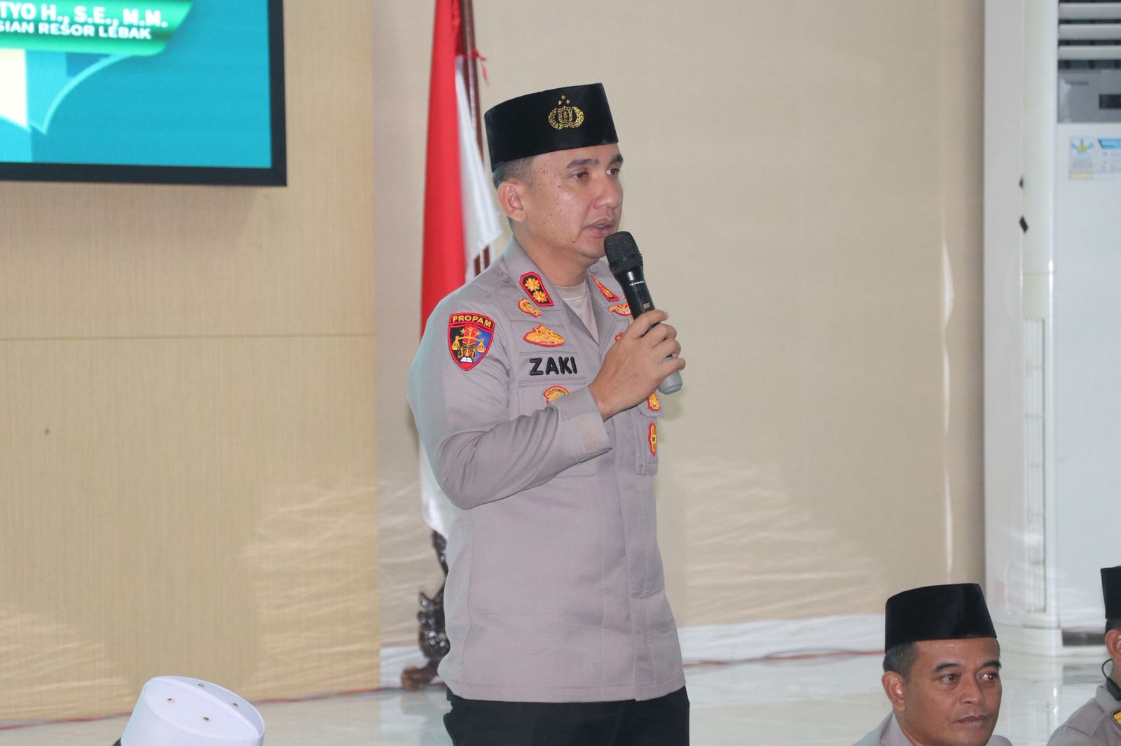 Dalam sambutannya, Kapolres Lebak AKBP Herfio Zaki, S.I.K., M.H. menyampaikan bahwa peringatan Isra Mi’raj Nabi Muhammad SAW merupakan momentum penting untuk meningkatkan kualitas keimanan dan ketakwaan seluruh personel Polri, khususnya Polres Lebak.
