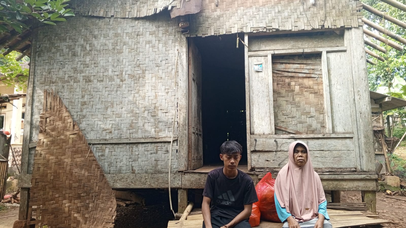 Rumah dinding terbuat dari anyaman bambu (bilik) yang sudah rapuh, lantai dari bambu yang sudah kusam, atap genteng jaman dulu atau disebut pontang yang sudah tua dimakan usia sehingga memungkinkan bocor kedalam rumah, pintu disamping ke arah dapur pun sudah rusak.