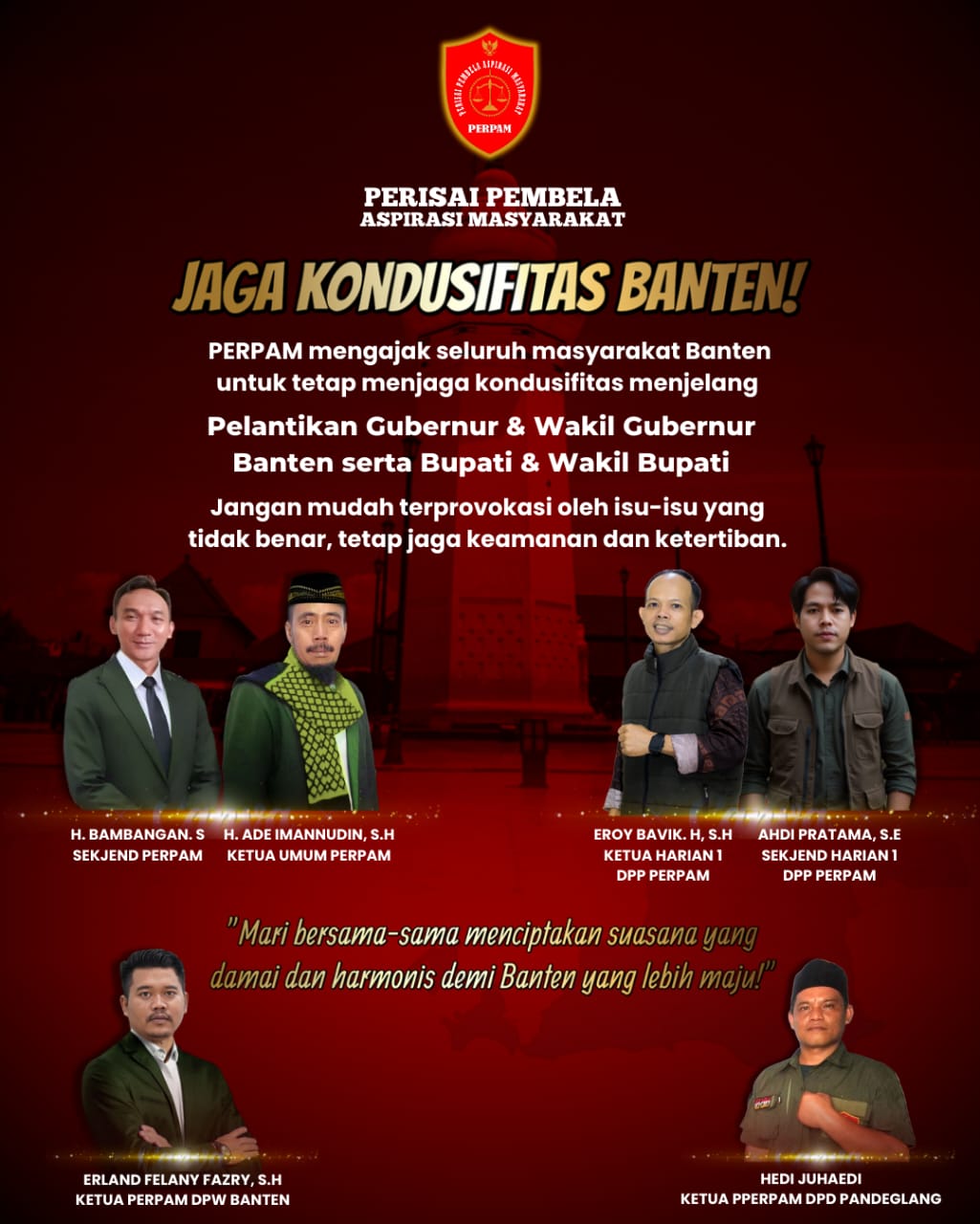 “Kami mengajak seluruh elemen masyarakat untuk tetap tenang, bersikap dewasa dalam menyikapi situasi politik, serta terus menjaga persatuan dan keamanan di Banten,” Ujar (Nama Perwakilan PERPAM).