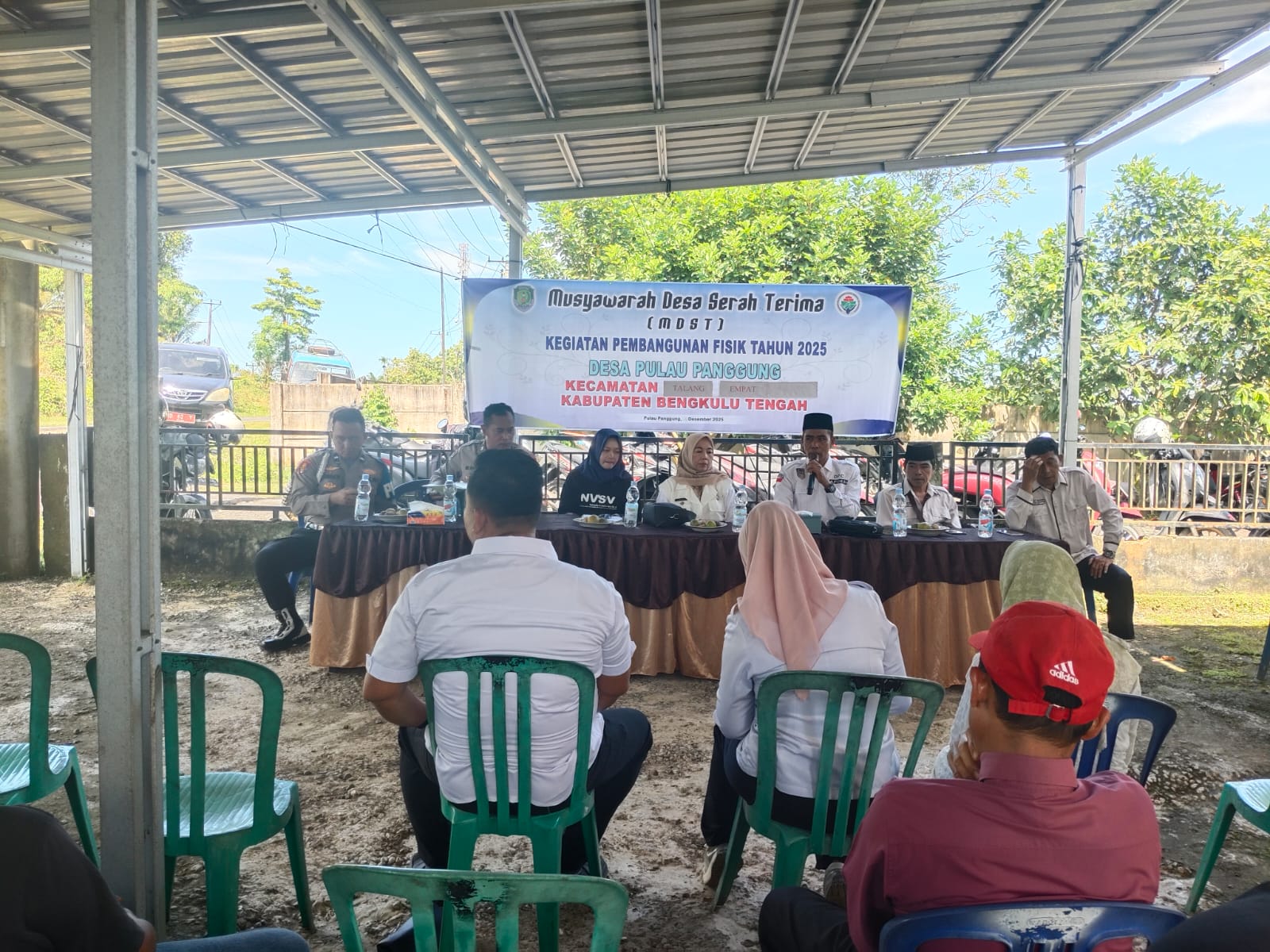 Mediakompasnews.Com – Bengkulu – Dengan adanya dana desa di tahun 2025 pemerintah desa pulau panggung kecamatan talang empat kabupaten Bengkulu Tengah propinsi bengkulu melaksanakan kegiatan musyawarah desa serah Terima kegiatan pembangunan fisik tahun 2025 yang kegiatan tersebut di danai oleh dana desa, kegiatan tersebut di laksanakan di kantor desa pulau panggung dan di hadiri oleh pemerintah desa palau panggung dan di hadiri pemerintah desa, anggota BPD, toko toko masyarakat, camat talang empat, babinsa, bhabinkamtibmas, dan unsur-unsur yang terkait lainnya. Rabu, 24 Desember 2025.