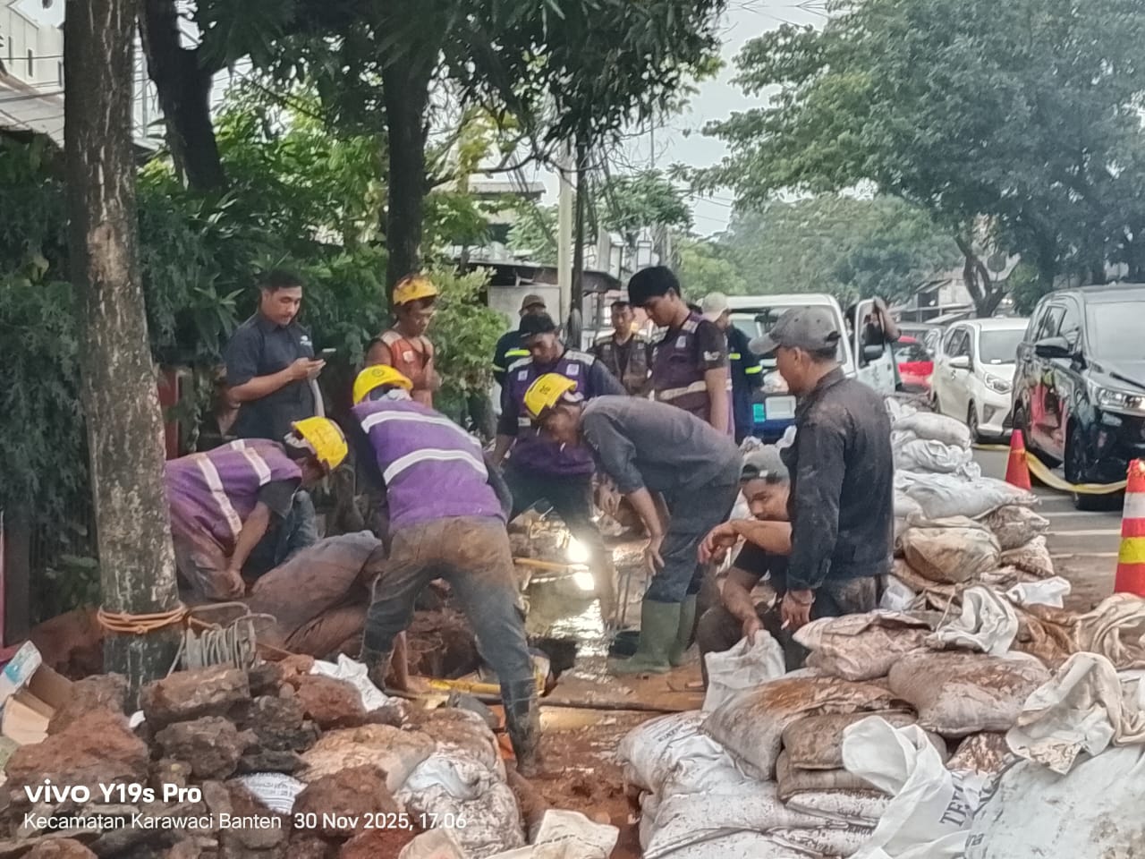 Mediakompasnews.Com – Karawaci – Perumdam Tirta Kerta Raharja Kabupaten Tangerang menunjukkan kesigapan dalam menangani banjir di RW 01, Dayat, Karawaci, yang terjadi pada pukul 01.00 WIB dini hari akibat kebocoran pipa PDAM di depan sekolah SDN Karawaci 1, Kelurahan Bojong Jaya, Kecamatan Karawaci. Karawaci (30/11/25).